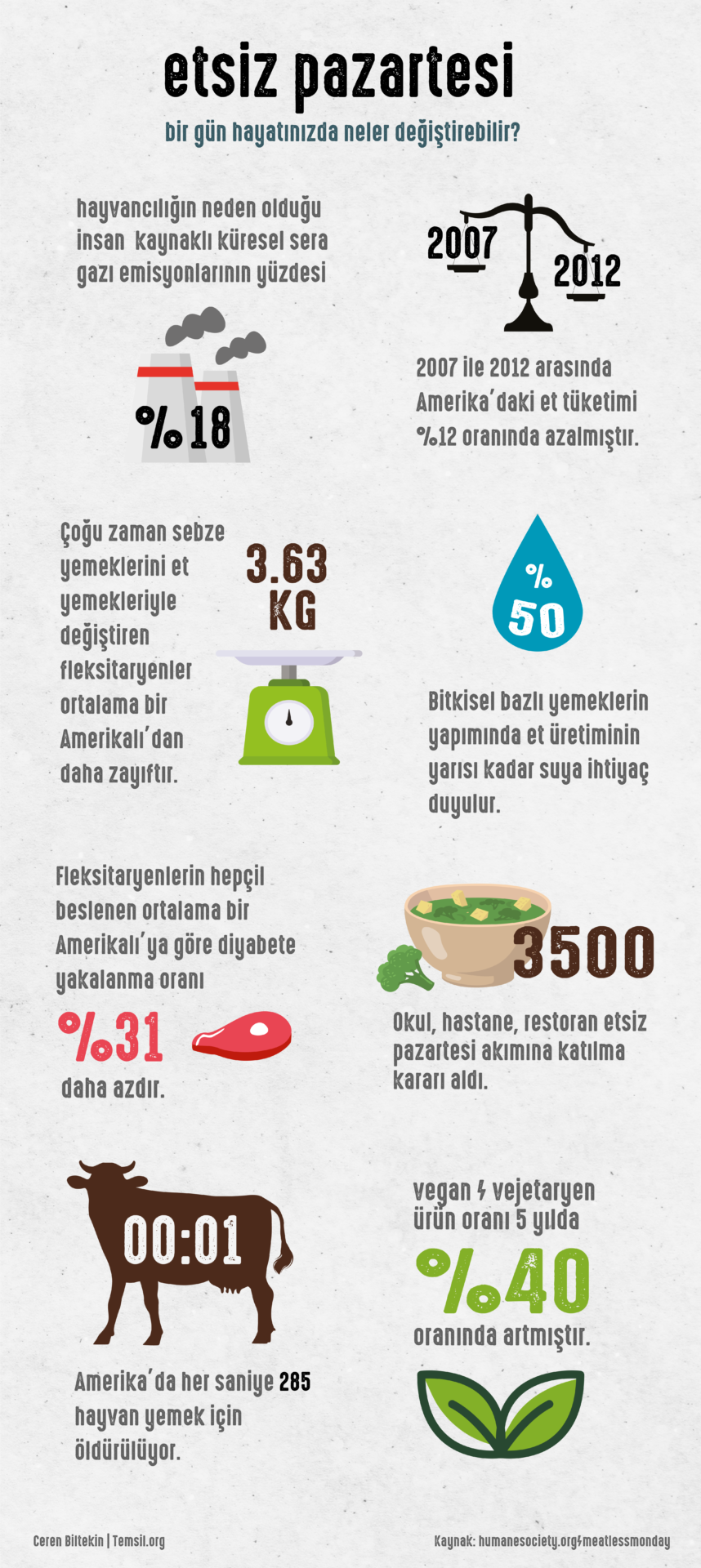 Haftada bir gün vejetaryen beslenme hareketi olarak başlayan “etsiz pazartesi” iklim krizine dikkat çekerken hayvan hakları konusunda da bilinçlenmeyi amaçlıyor. Neden “etsiz pazartesi” sorusunu sormadan önce, et yemek hakkında bilmediğimiz bazı istatistiklere göz atalım.